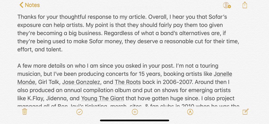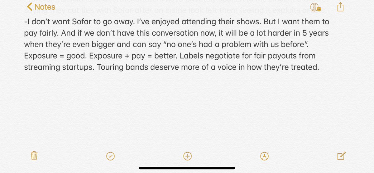 Record labels bargain to get bands a fair deal from streaming apps. But bands exploited by Sofar are too small/fragmented to benefit from collective bargaining. Press criticism got Sofar to raise payouts in the past, so clearly it knows it’s in the wrong too. My response: