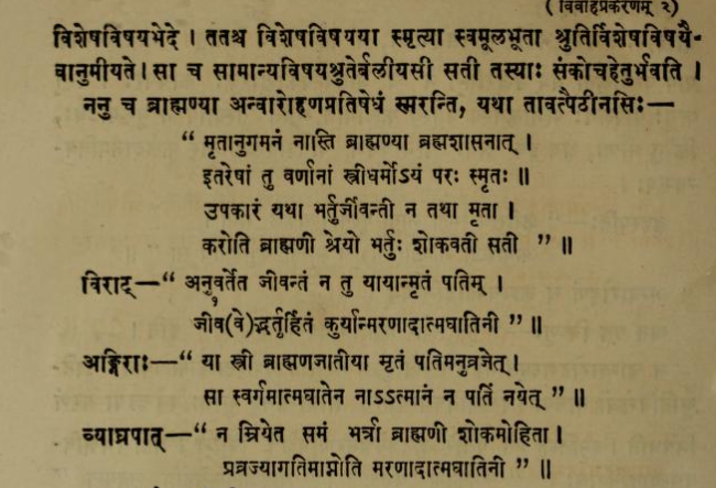 28. For the early opposition of smRtikAras to brAhmaNi women committing sahagamana: See following portion from aparArka commentary on yAj~navalkya smRti. See particularly those marked as paiThInasi (mRtAnugamanaM nAsti...), AGgiras (yA strI..) & vyAghrapAd (na mriyeta samaM...)
