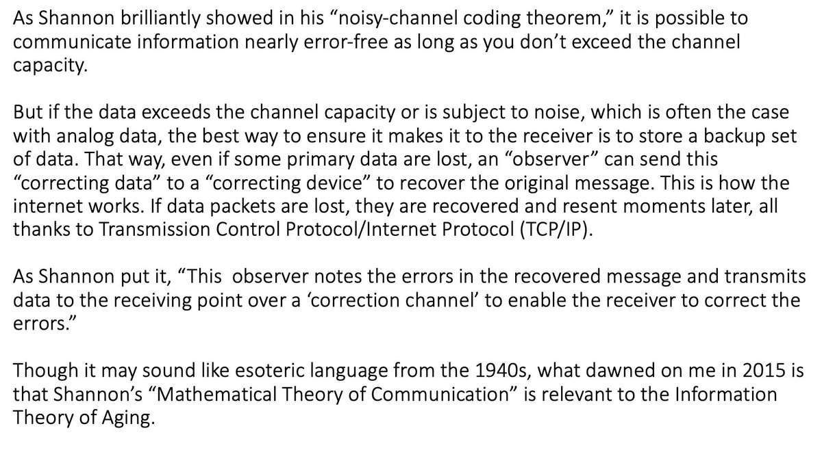 Shannon’s research was intended to improve the robustness of electronic and radio communications between two points. But he discovered about preserving and restoring information can be applied to aging.