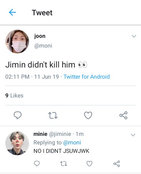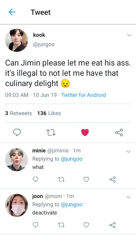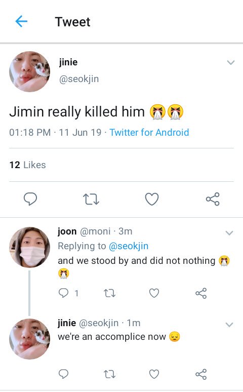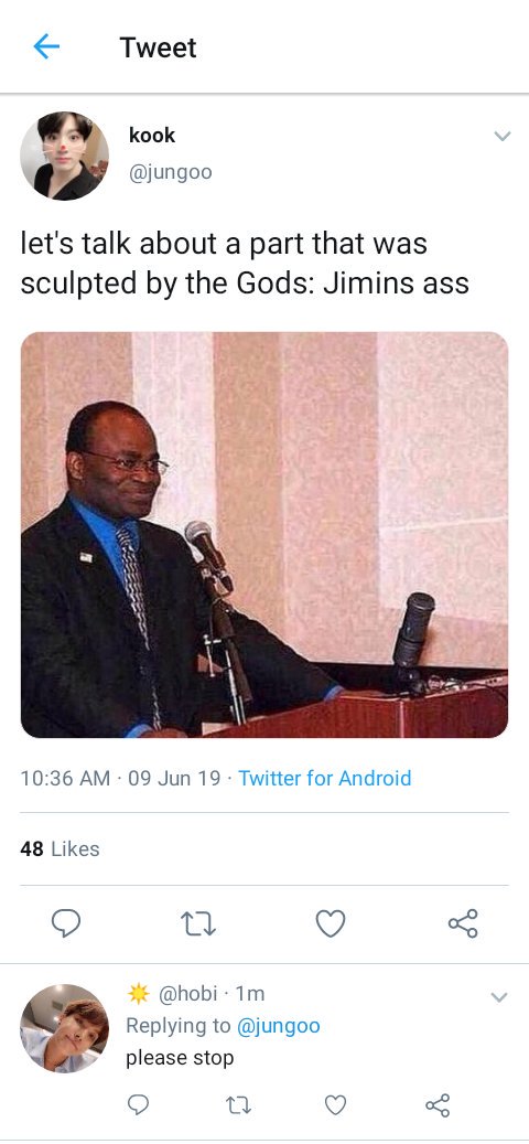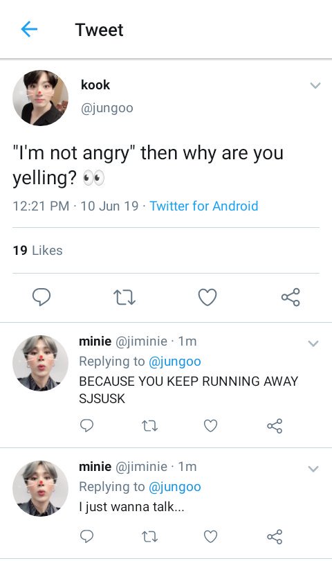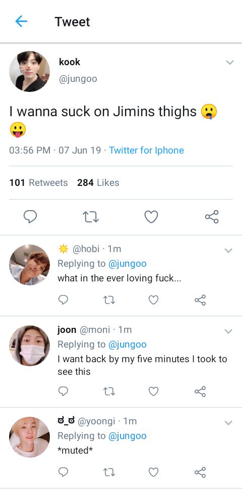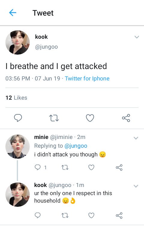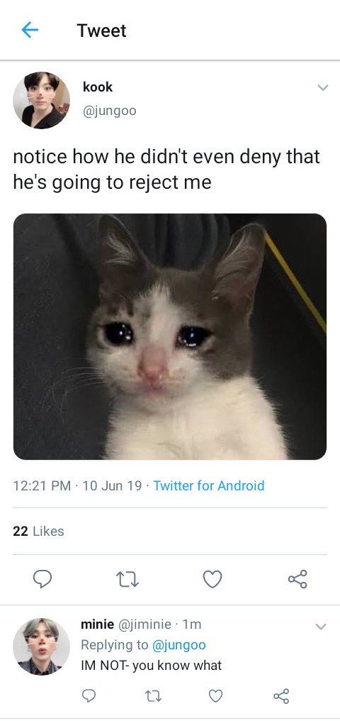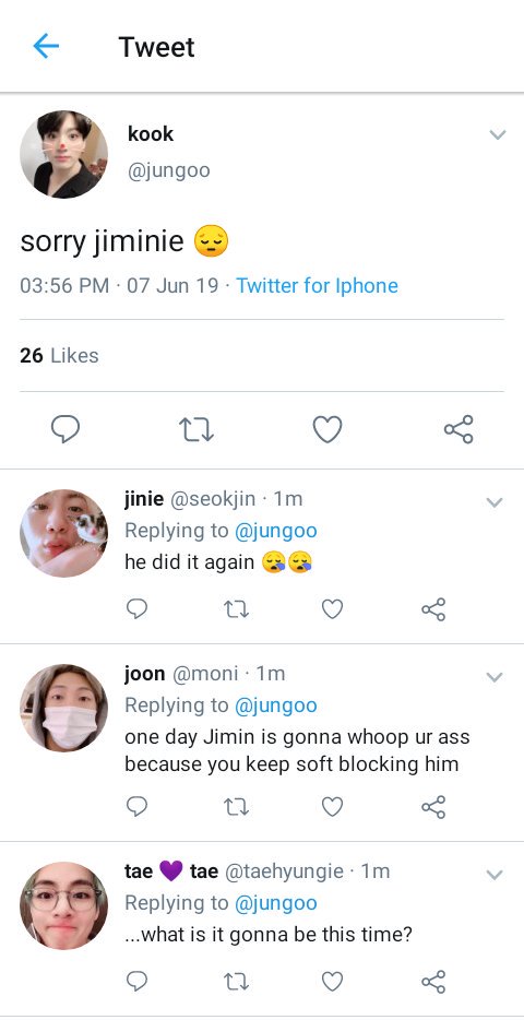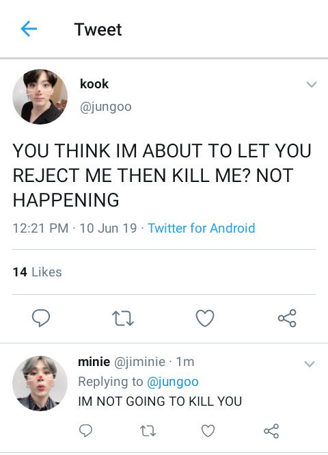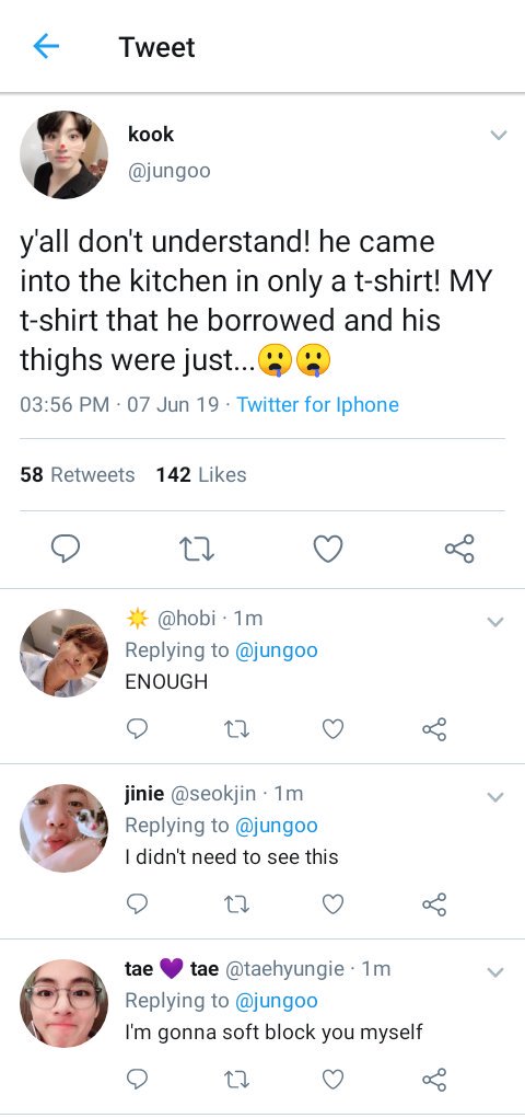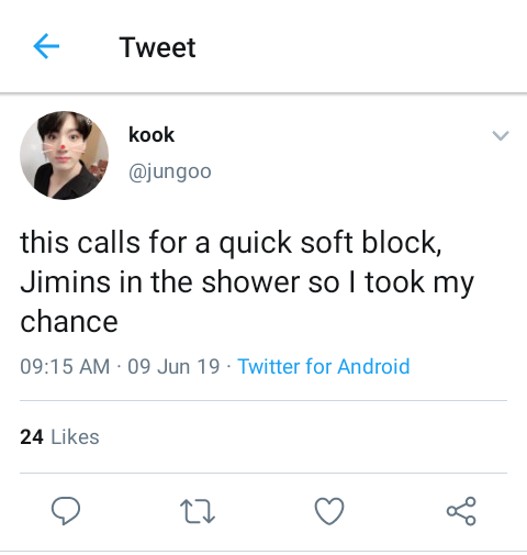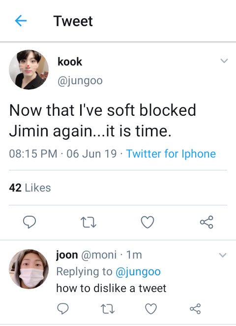 where jungkook would always soft block jimin whenever he makes a thirst tweet about him only to realize that he forgot to soft block him this time around when jimin suddenly replies under his tweet.
