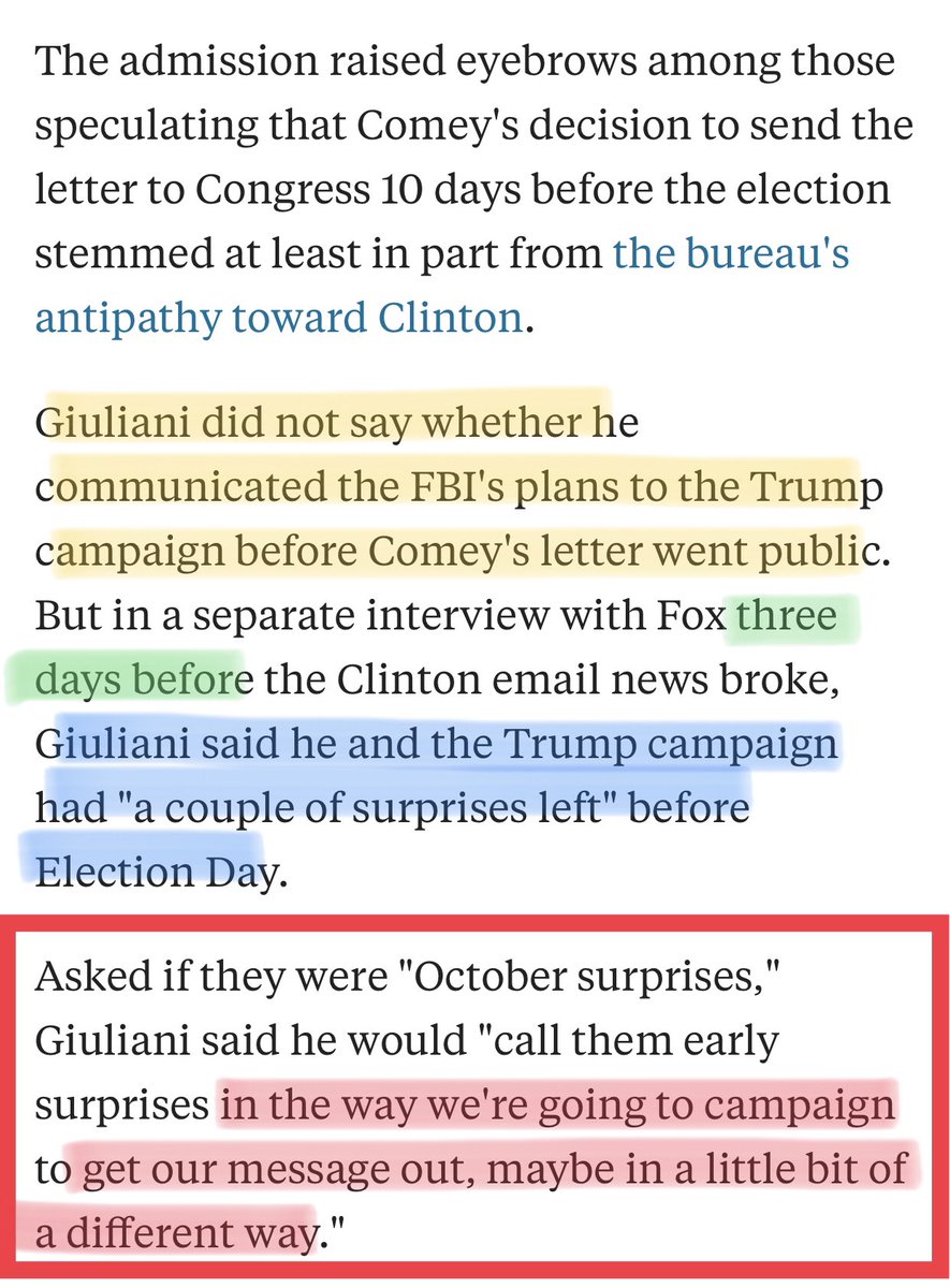 🤔 coordinated timing of release of info. ➡️ Giuliani said he would "call them early surprises in the way we're going to campaign to get our message out, maybe in a little bit of a different way."