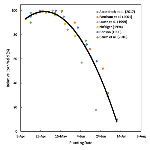10. When you plant 30-45 days late as we have in many areas this year you are more than likely chopping of a big chunk of the grain fill period. Hence, the large expected decline in corn yield for planting in June. Not really that complicated.