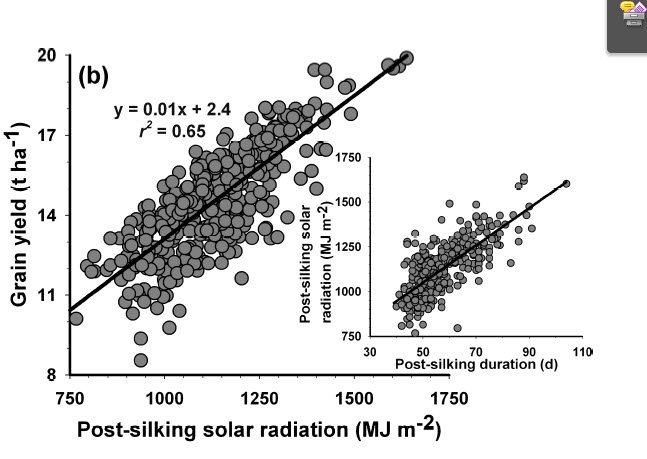 9. Chart shows relationship of corn yield to sunshine (solar radiation) absorbed during grain fill. Critical for corn yield. More total sunshine = more corn yield. Sunshine per day is pretty constant, so key is the number of total days during the grain fill period.