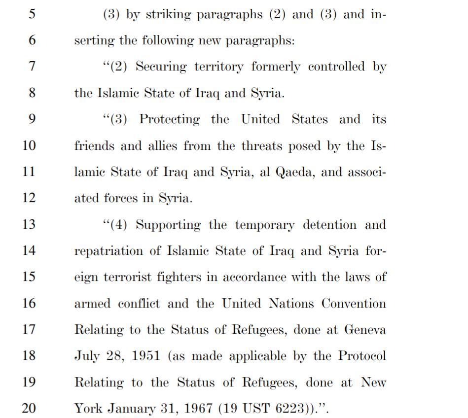 1. "Securing territory formerly controlled by ISIS" (that's a problem under international law) 2. Temporary detention and repatriation of ISIS fighters "in accordance with the laws of armed conflict"