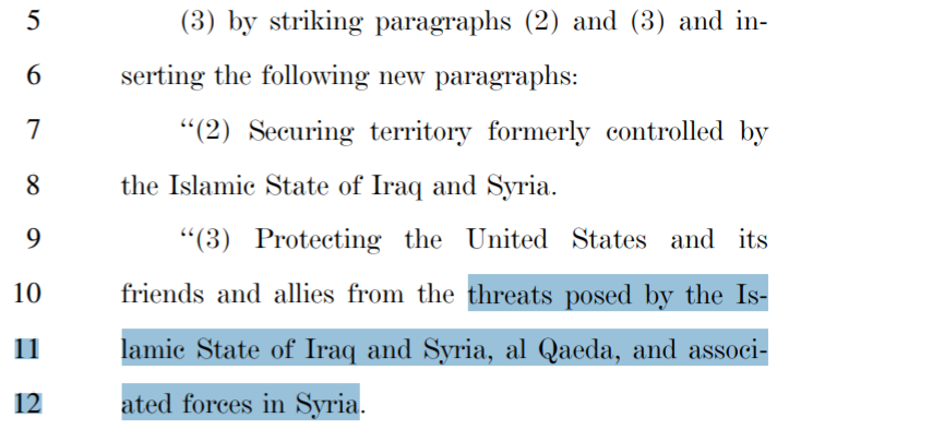 Senate draft: "threats posed by" ISIS, al Qaeda, and associated forces in Syria