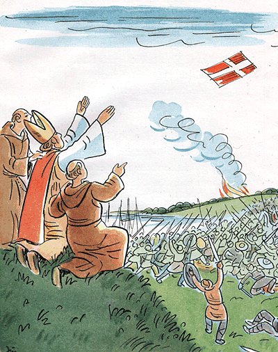 Entonces, necesitaba 2 soldados para mantenerse los brazos arriba y cuándo justo estaban por perder los daneses, la bandera cayó del cielo como un mensaje de Dios. El Rey mostró la bandera a sus tropas, y la cruz les inspiró a la victoria 🇩🇰💪