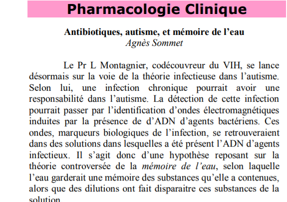 Un "traitement" de l'autisme basé sur l'hypothèse de bactéries détectées par un test dont la validité est contestée par la communauté scientifique. Montagnier avait fait l'annonce suivante à l'Académie de médecine en 2012. web.archive.org/web/2013031308…
