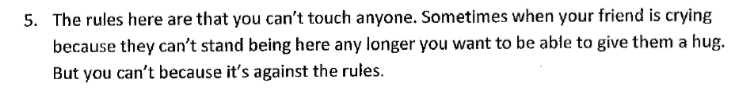 At Homestead, they were told strict rules during orientation: no more than five minutes for showers, no talking to kids of the opposite sex, no touching of any kind — not even hugs or handshakes. Some found the no-hugging rule difficult: