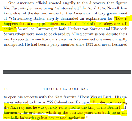 They went so far that one US official wondered "how it happens that so many prominent nazis in the field of musicology are still active." btw, for anyone wondering about this source, this is from Frances Saunders, an anti-communist: 'The Cultural Cold War'