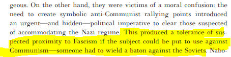 The Information Control Division was a psyops division, and Nabokov & Josselson happily helped Wilhelm Furtwängler, conductor of the Berlin Philharmonic under the Third Reich, avoid undergoing the denazification procedure once he threatened to go to Moscow.