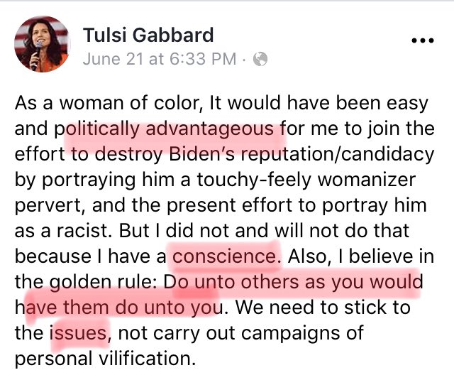 While @TulsiGabbard agreed with Biden AND Clyburn (House Majority Whip, highest-ranking African American in Congress who said “You don’t have to agree with people to work with them.” Tulsi got backlash from some of her own supporters (not me). 7/