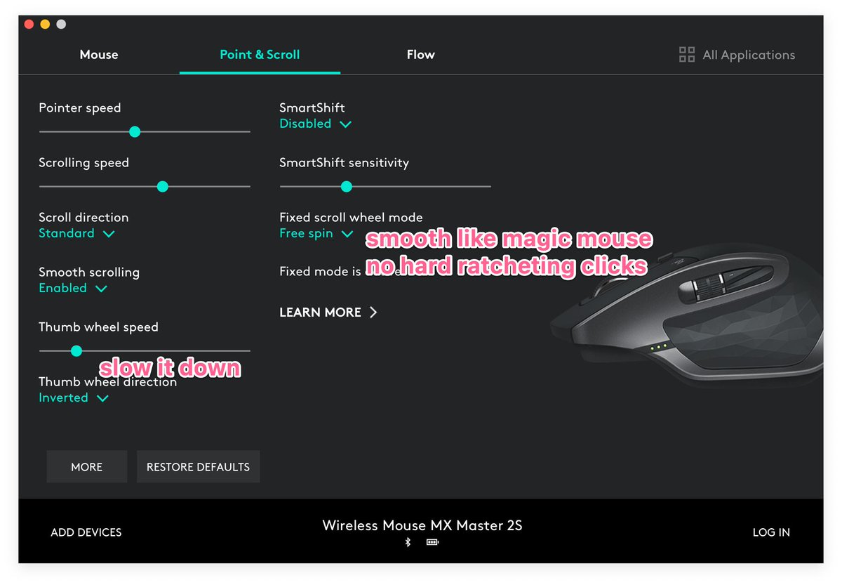Coming from a magic mouse, the MX Master 2S wasn't an instant switch over, but I think these settings make me feel most comfortable with it.