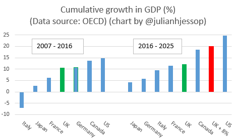 1⃣ for context, the UK economy has grown by about 12% since 2016, outpacing Japan, Germany, Italy and France. If you add another 8% the UK would have been the fastest growing economy in the G7 - bar only the US - and left its EU peers far behind.