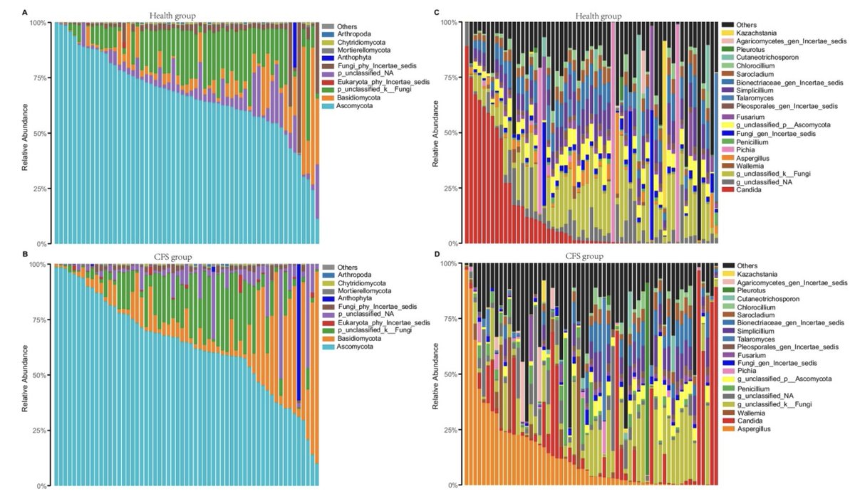 1) 🇨🇳 A Chinese study looked at the mycobiome, the fungi living in the human body, in 59 ME/CFS patients and 59 controls.