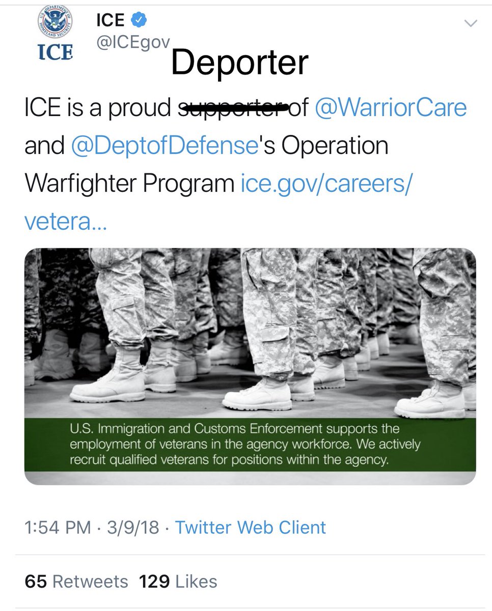 1/2 .@ICEgov tweeting this supporting employing veterans, while deporting brown veterans and their families. You don’t believe me? Check the next tweet.