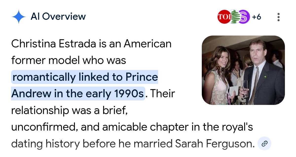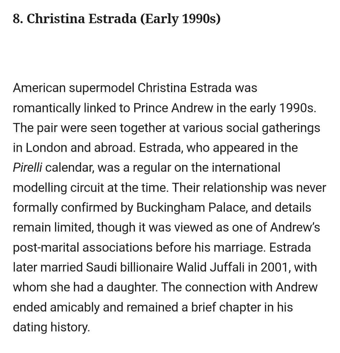 Let's move on, turning our attention now to Pirelli calendar model Christina Estrada. She had a short dalliance with Randy Andy, breaking up amicably and going on to marry Walid Juffali, a billionaire and Clinton Foundation sponsor with a PhD in neuroscience.