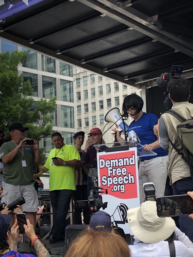 Crowd is not really digging Milo’s surprisingly vicious Laura Loomer impression. People drifting away towards barrier separating them from Antifa, as Milo as Loomer declares she’s been “banned from the hotel buffet.”