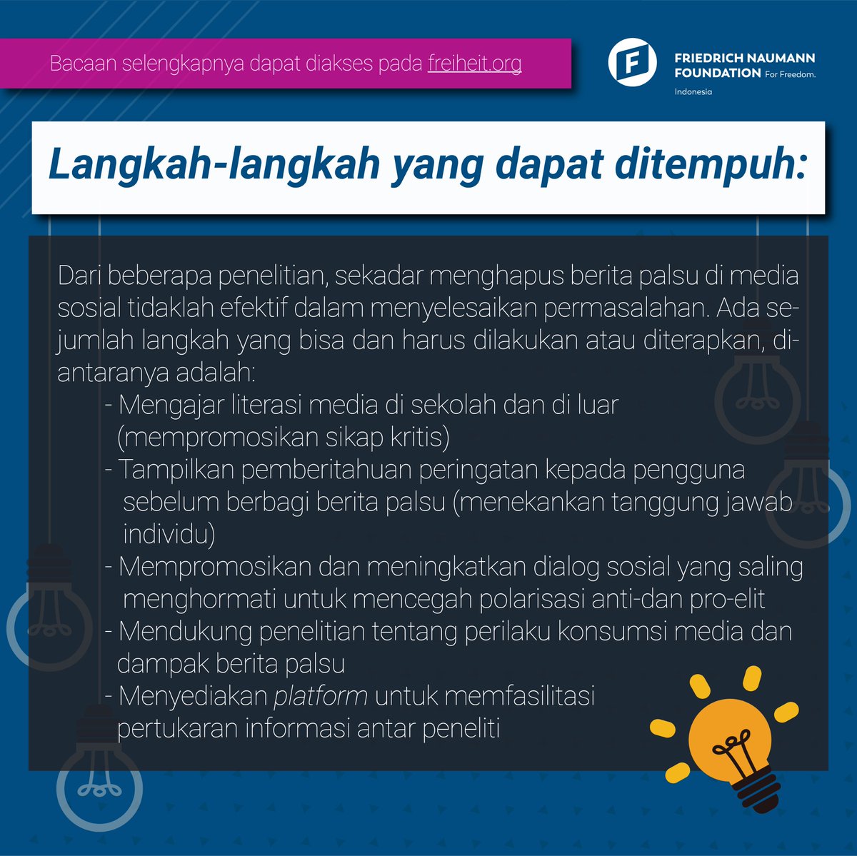 Publikasi lengkap terbitan Friedrich Naumann Stiftung für die Freihet Pusat yang berjudul “What Can Be Done to Counter Fake News” dapat diakses pada freiheit.org. Untuk ringkasannya, ikuti penjelasannya pada utas ini 📑📝