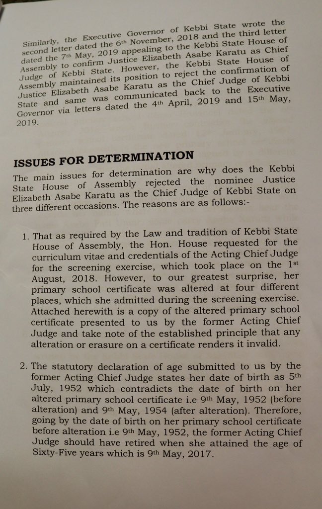 When the Chief Judge was asked about the alterations in her documents she was alleged to have stated that her headmaster altered her date of birth and year of graduation from primary school. We all know the implication of this on retirement in the ministry.