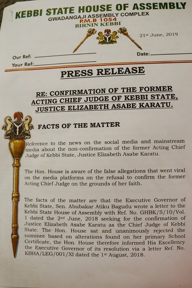 When the erstwhile Chief Judge (a devout Christian) of the state retired, the same Kebbi State Governor being accused by Hon. Justice Elizabeth Asaba Karatu, expressly facilitated her ascension to the position of Acting Chief Judge, to crown her efforts & confirm her feat.