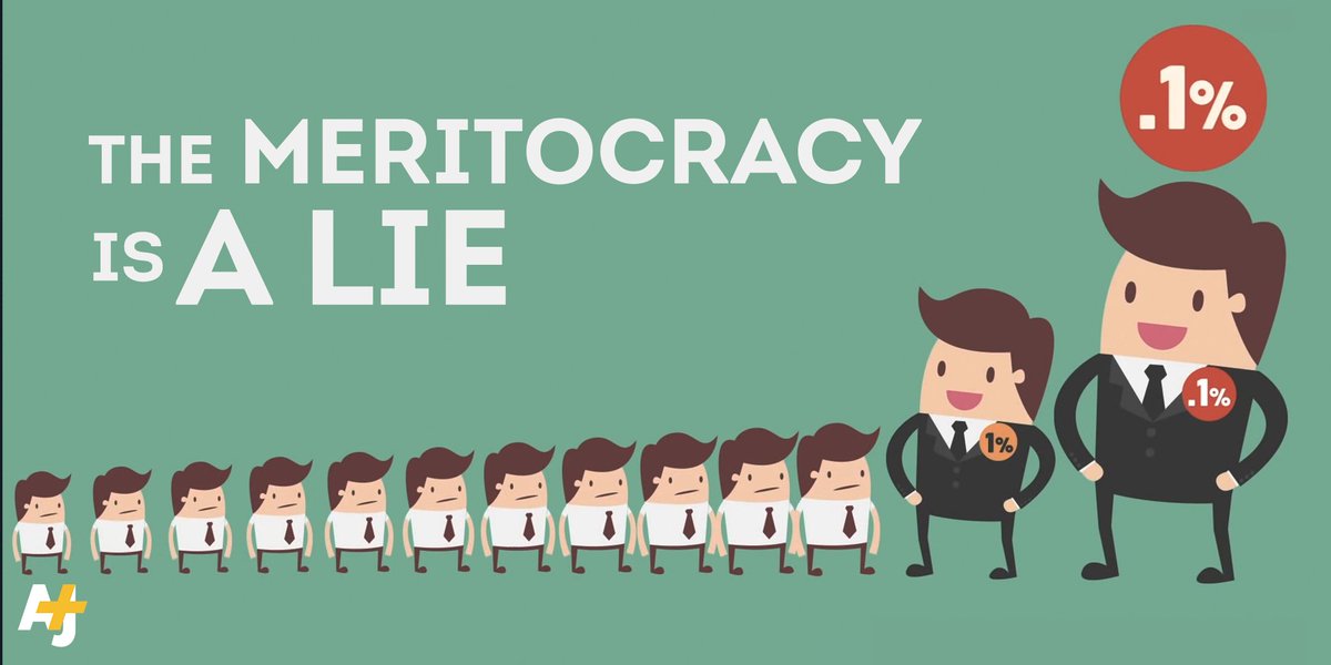 Today, the idea of a meritocracy is commonly accepted in America. Merit is typically judged by going to fancy schools. Going to Harvard, in other words, doesn't just mean that you're smart – it qualifies you to rule the world. (2/13)
