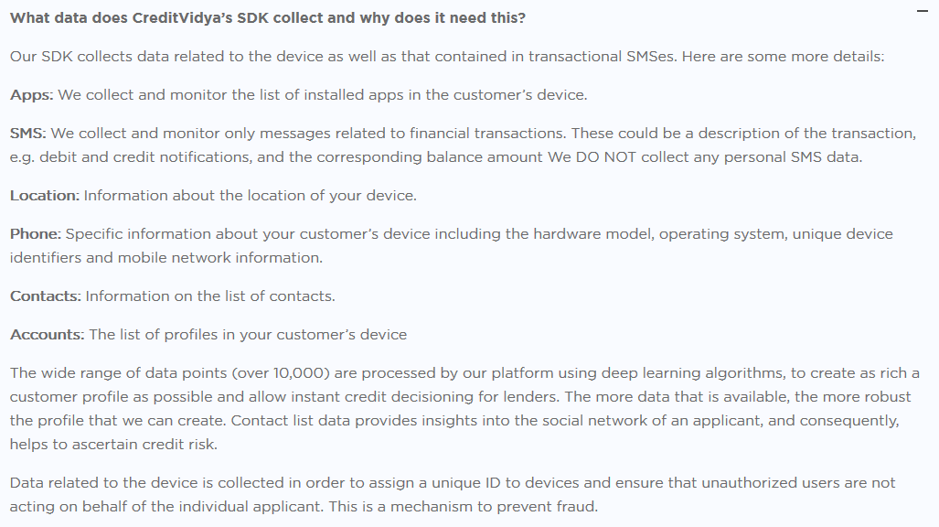 Personal data collected by CreditVidya's SDK: creditvidya.com/faqs/