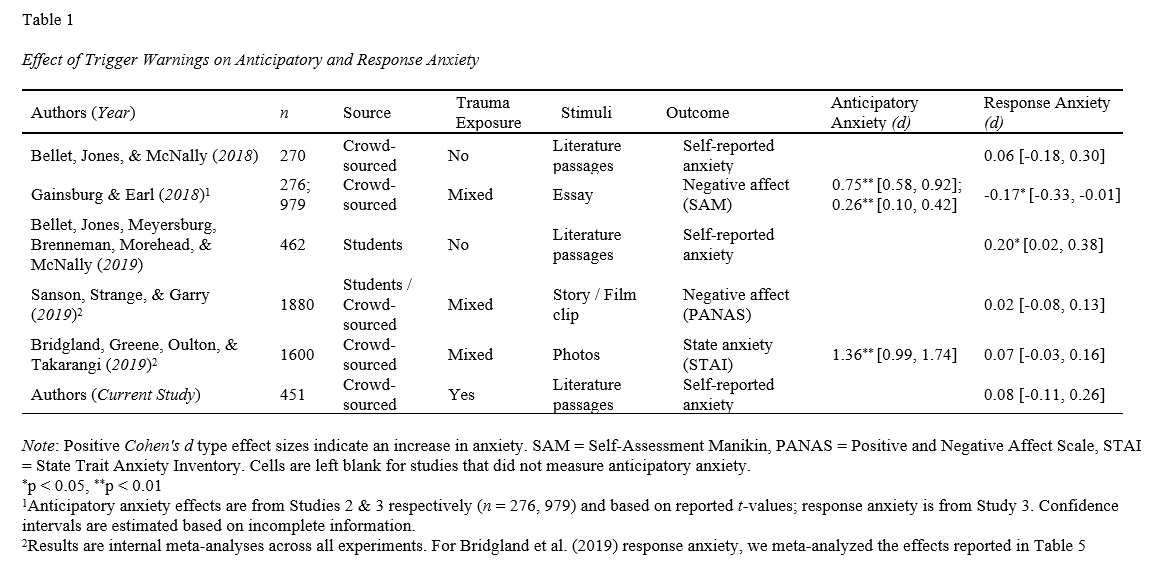 Our new preregistered paper on trigger warnings in trauma survivors was just released as a preprint! We find that no matter how you slice it, trigger warnings just don't help. osf.io/axn6z (1/8)