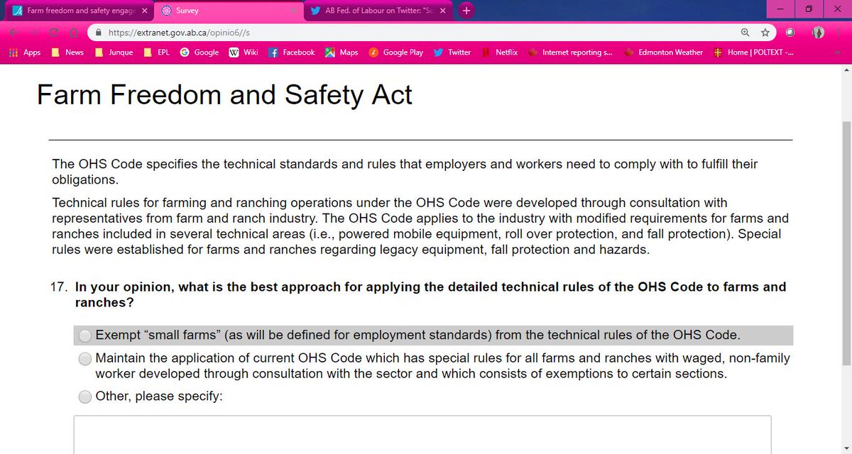 Here it is again, Minister @DevinDVote: the proposal to exempt farms and ranches (all of them?) from employment standards. Question #19 of the survey.