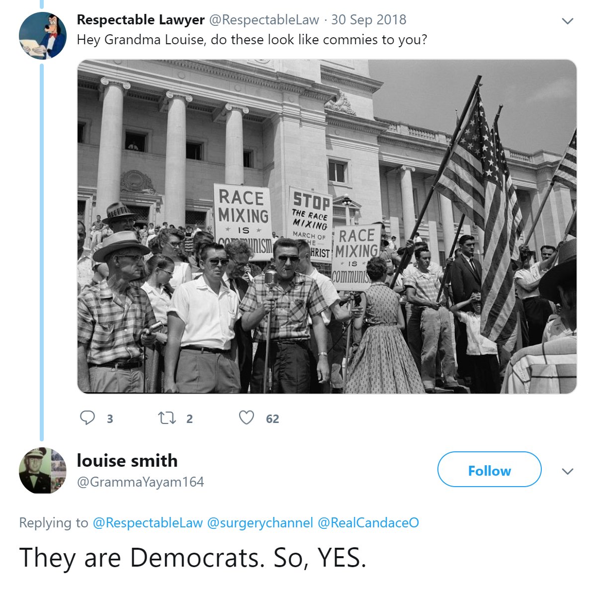 I really love all the MAGA replies to this tweet pointing out the people in this picture were Democrats at the time, as if you could look at this photo and not see the American southern conservative movement uninterrupted.