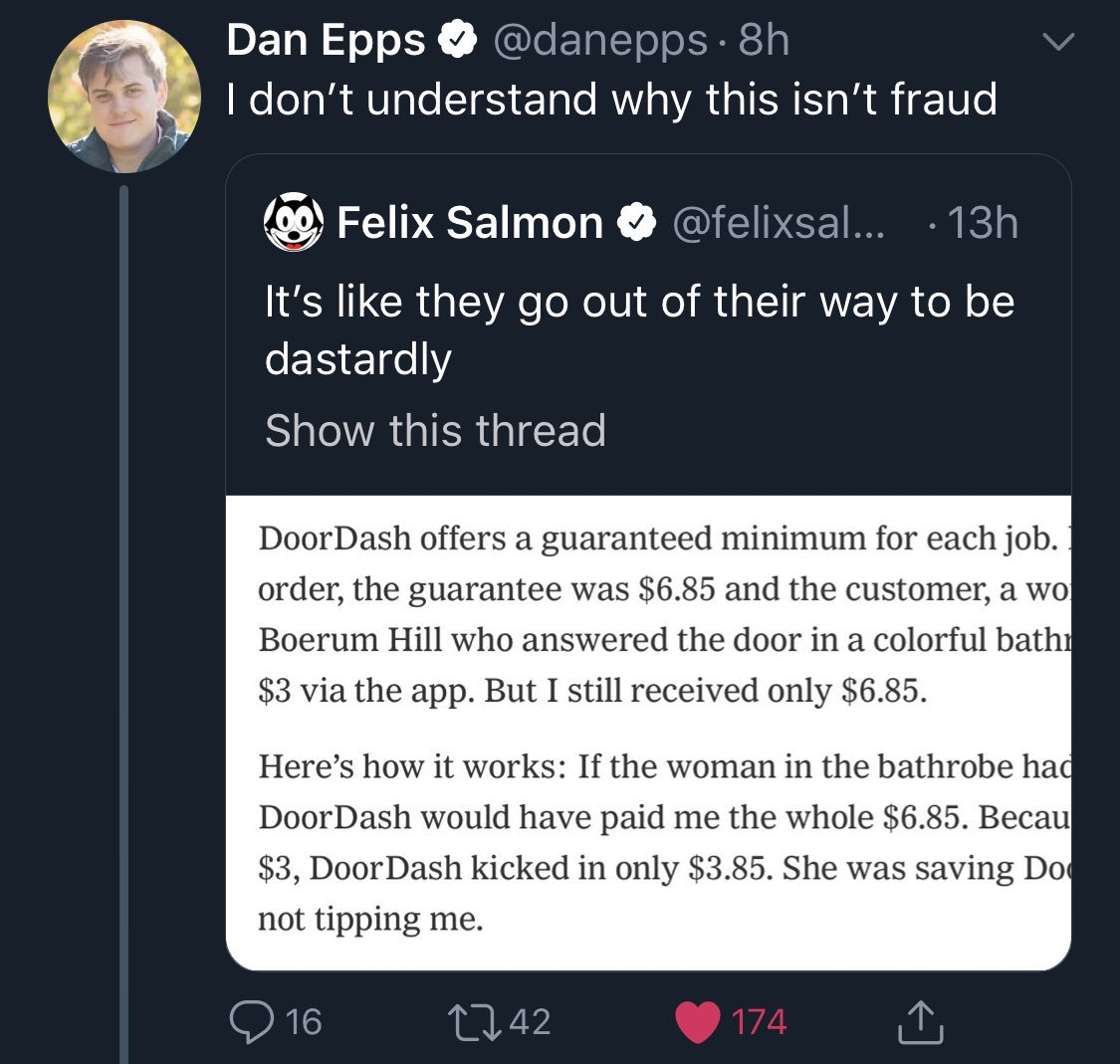 The “16” replies to Dan’s initial tweet is perhaps as deceptive as DoorDash’s approach to tipping appears to be. You could spend the next three hours following all of the threads that follow from this: