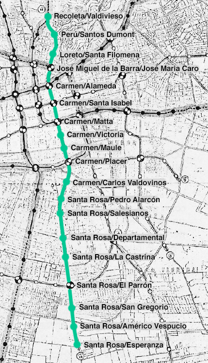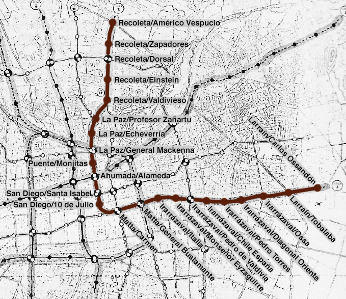 @metrodesantiago La Línea 3 iba a hacer parte del recorrido de la actual Línea 2, partiendo por Recoleta, pero después entrando por avenida La Paz hacia el centro. De ahí hacia el oriente el trazado es casi calcado al de la línea actualmente existe (aunque originalmente eran más estaciones).