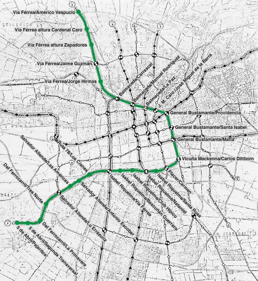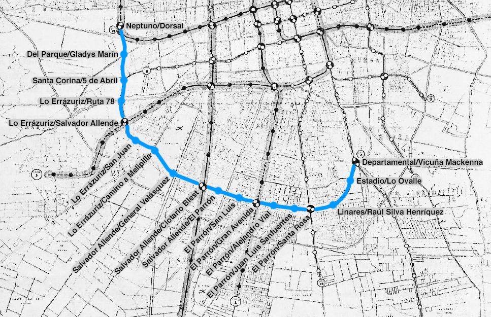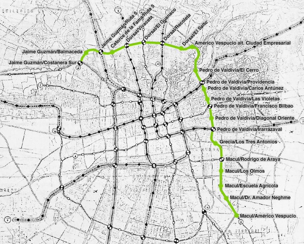 @metrodesantiago La Línea 13 se proyectaba aprovechando parte del semicírculo que genera la avenida Dorsal, para luego bajar por Pedro de Valdivia y Macul. Los trazados por esas últimas 2 avenidas terminaron formando parte de las líneas 6 y 8, respectivamente.