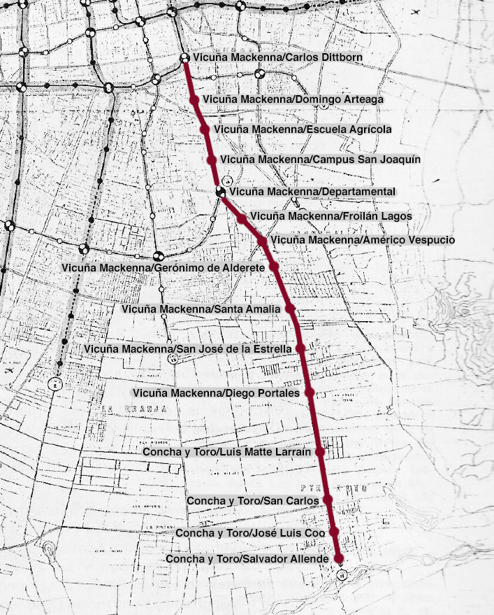 @metrodesantiago Finalmente, la Línea 15 se proyectaba desde la actual estación Ñuble hasta Puente Alto, casi llegando a la orilla del río Maipo. Varias de las estaciones proyectadas coinciden con ubicaciones de paradas en las actuales líneas 4 y 5.