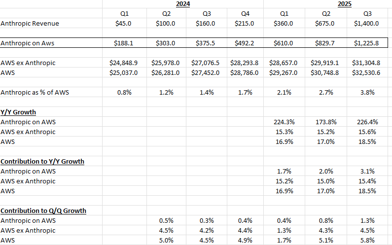 Ed Zitron claims to have exact monthly cash spend (net of discounts and credits) by Anthropic on AWS. No idea the veracity. Since cash spend, it wont directly map to revs, but wth. Means Anthro is a 3.8% customer and driving 310bps in Y/Y growth in Q3 25 from $1.2B in cash spend.
