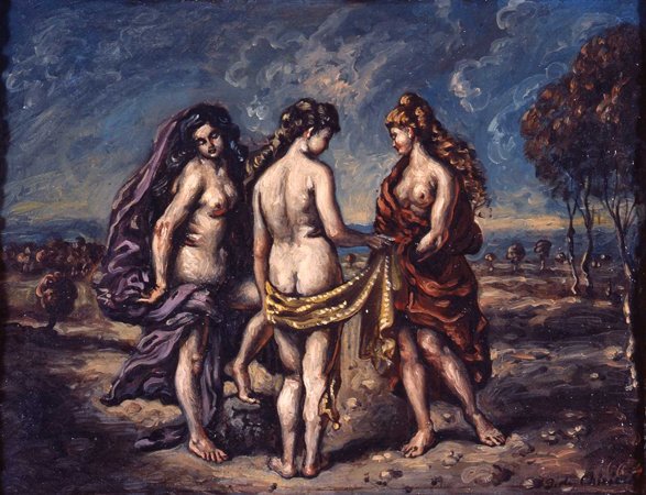 Y es que la mitología se convierte en la excusa perfecta para pintar tres magníficos desnudos. La interactuacón entre ellas se manifiesta por las miradas y los brazos