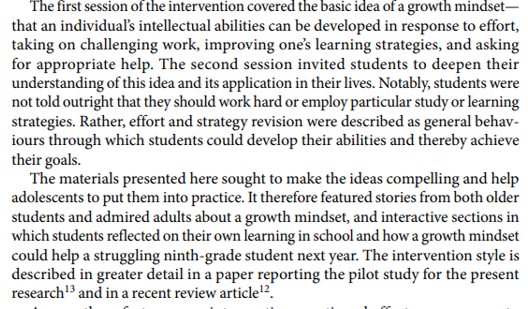 2) In research-design terms, this was bulletproof: pre-registered, randomly-assigned, teachers didn't know which students got the growth mindset intervention and analysis team didn't know the hypothesis or which group was which.