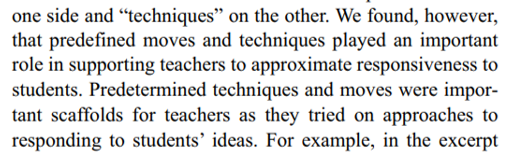 2) Teacher educators can encourage responsiveness by offering feedback focusing on why a teacher's action is useful in a given circumstance (rather than why it's a 'best practice' in general. But - trained teacher moves are an important part of this.