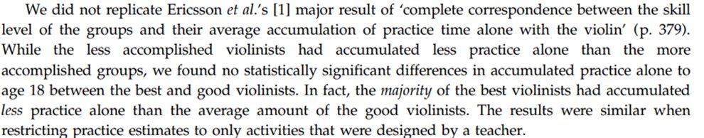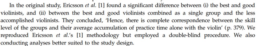 The centrepiece was an analysis of the role of deliberate practice among violinists. In this paper, @BrookeMacnamara and team have conducted a careful, preregistered replication of Ericsson's work. artscimedia.case.edu/wp-content/upl…