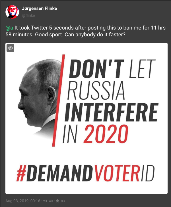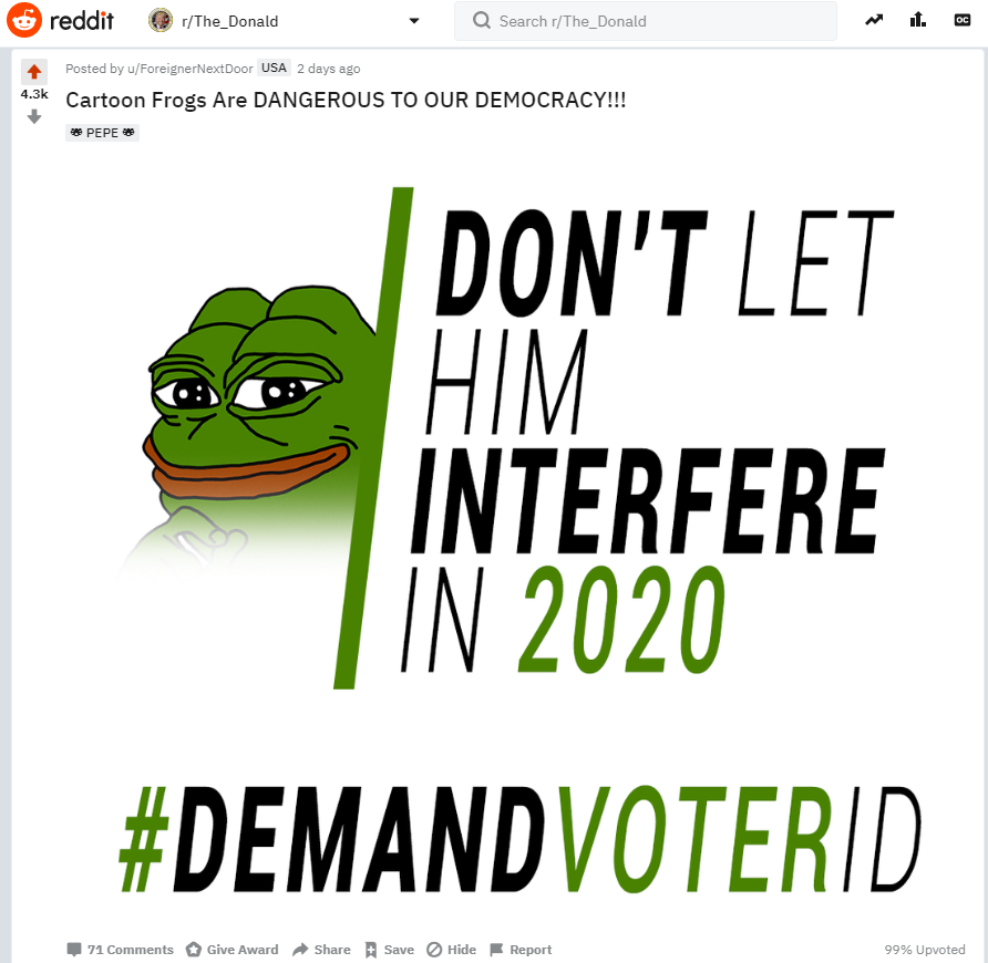 On Tuesday, a user posted a meme of Putin, with the hashtag "DemandVoterID." The meme & hashtag refer to a troll campaign from 2018 following the Trump-Putin Helsinki press conference (dailydot.com/layer8/demand-…). The post has been one of the top posts on the subreddit this week.