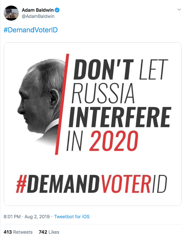 The troll campaign continues to spread on Twitter. Here's the Putin meme and hashtag from that thread on The Donald subreddit being pushed by actor Adam Baldwin last night.