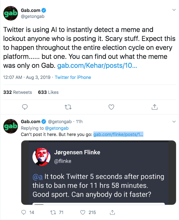 Gab is now also indirectly promoting the meme & campaign by linking to Gab accounts saying they got penalized by the platform for pushing it.