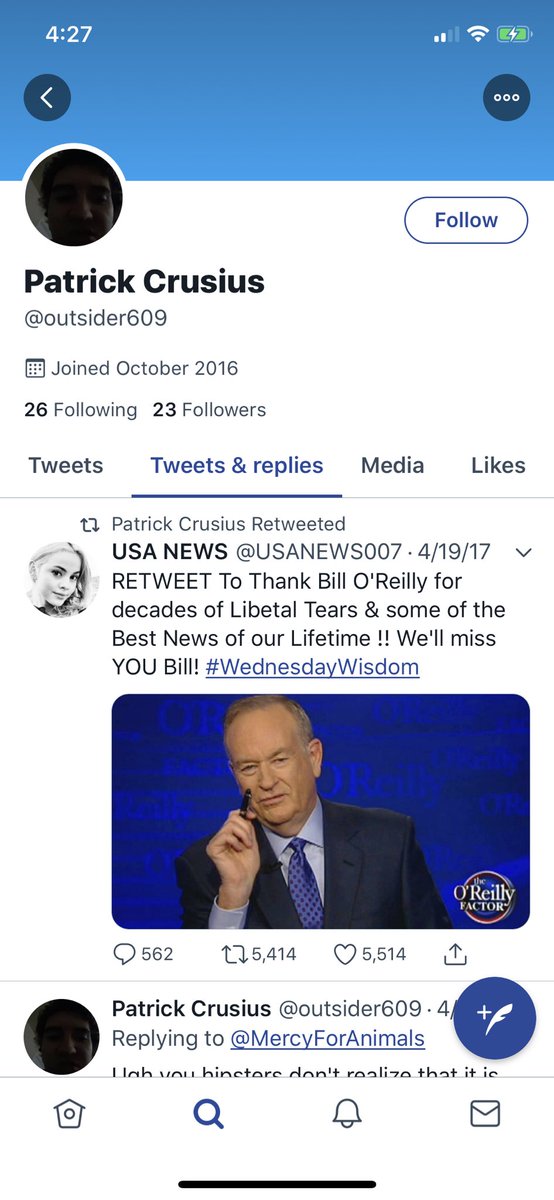 This was his very last retweet, on this account anyway. Thanks to Bill O’Reilly for owning the Libs. So typical
