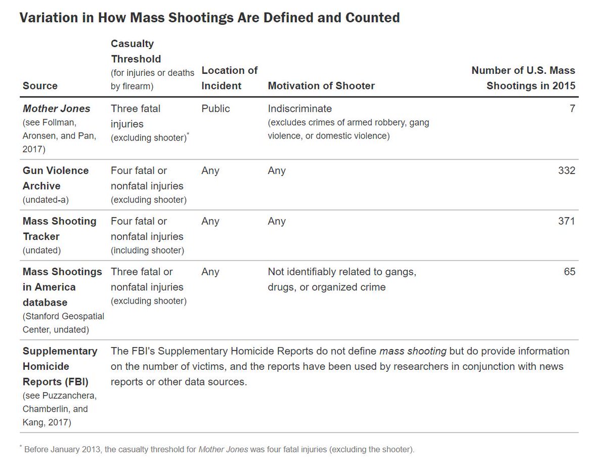 Of commonly cited stats, only those from the FBI and Mother Jones take lack of motive — that is, no intent of robbery, domestic violence, or gang violence, just attempting to kill as many innocent people as possible — into account. Others should be disregarded.