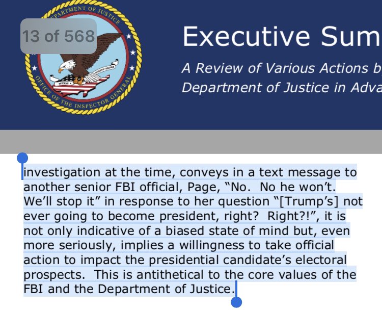 senior FBI official, Page, “No. No he won’t. We’ll stop it” in response to her question “[Trump’s] not ever going to become president, right? Right?!”, it is not only indicative of a biased state of mind but, EVEN MORE SERIOUSLY, implies a...