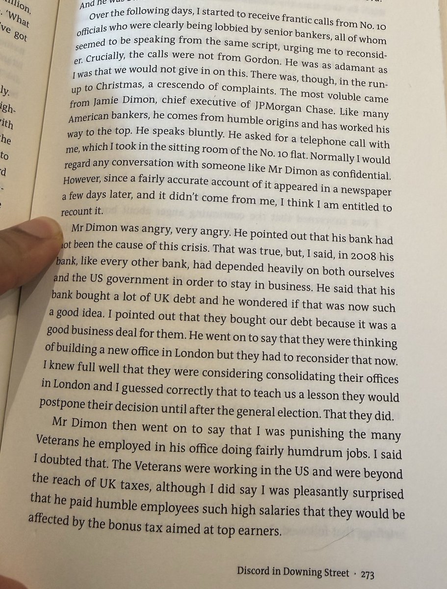 And here late Chancellor describing in his book Beyond the Brink how a “v angry” Dimon rang him up in December 2009, days after Mandelsons “mild threat” email