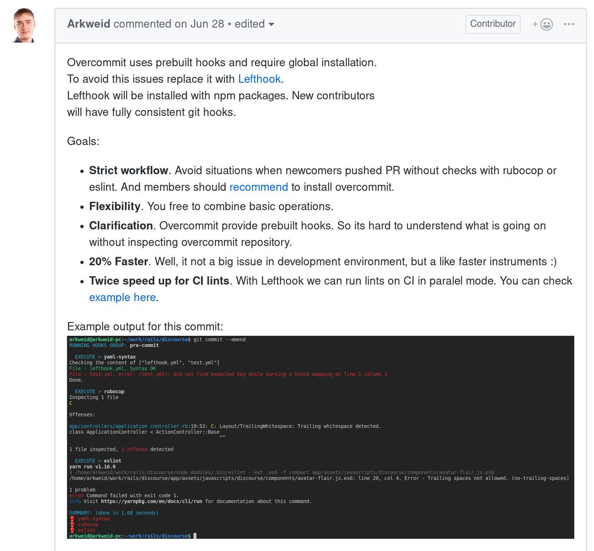 Посмотрите, как автор Lefthook @Arkweid переборол страх и очень популярный проект теперь использует его менеджер гит хуков github.com/discourse/disc…