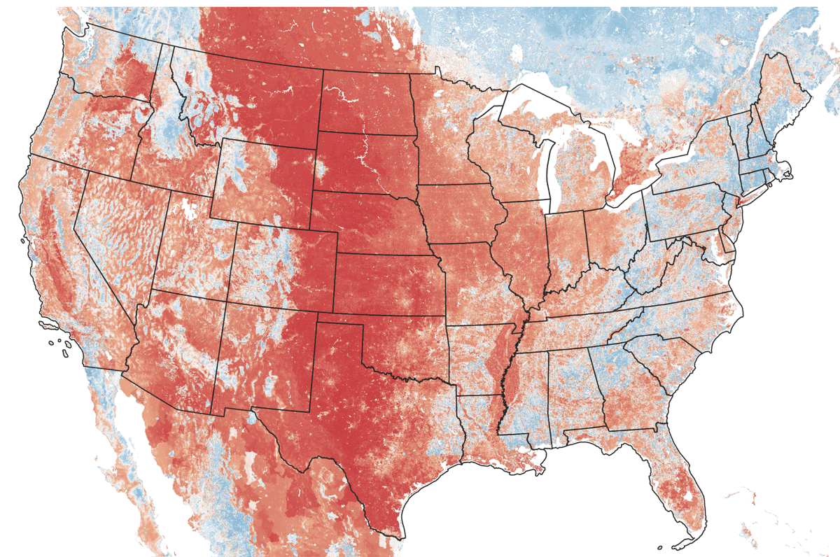 This is a map of the United States. The red areas are regions where native species populations have fallen below the "safe" limit for ecological stability. There is a lot of red. washingtonpost.com/business/2019/…