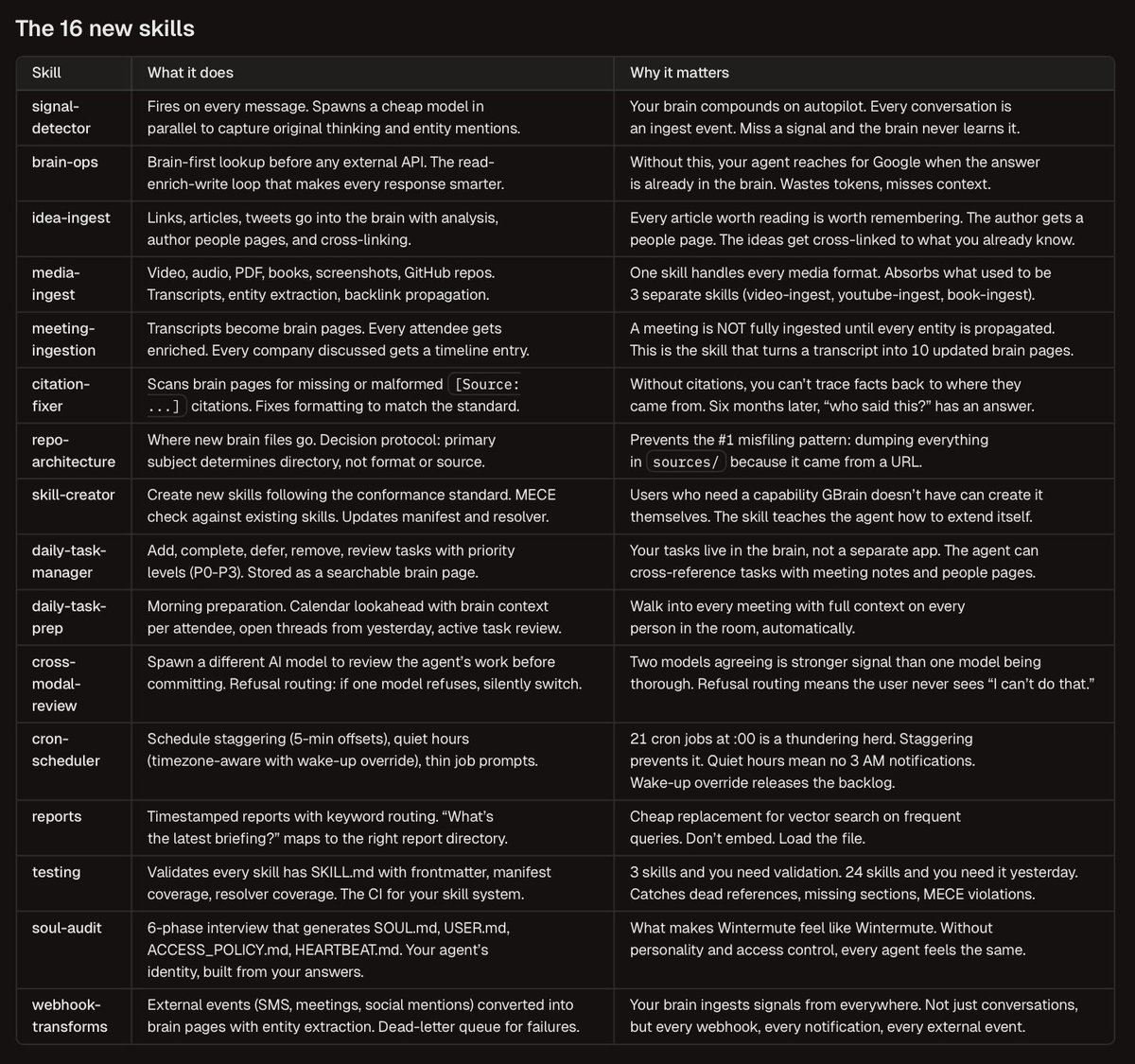 Your GBrain now detects signals, makes sure it checks memory at the right time, ingests media, meeting transcripts, fixes citations, files brain pages in the right place, manages tasks, manages crons, and takes webhooks natively.