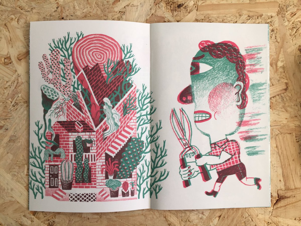 9. Living Things 10: House Plants by Joohee Yoon, published by Little Otsu. Not risograph, but two colour litho with a simple beginning to end narrative about house plants growing out of control.