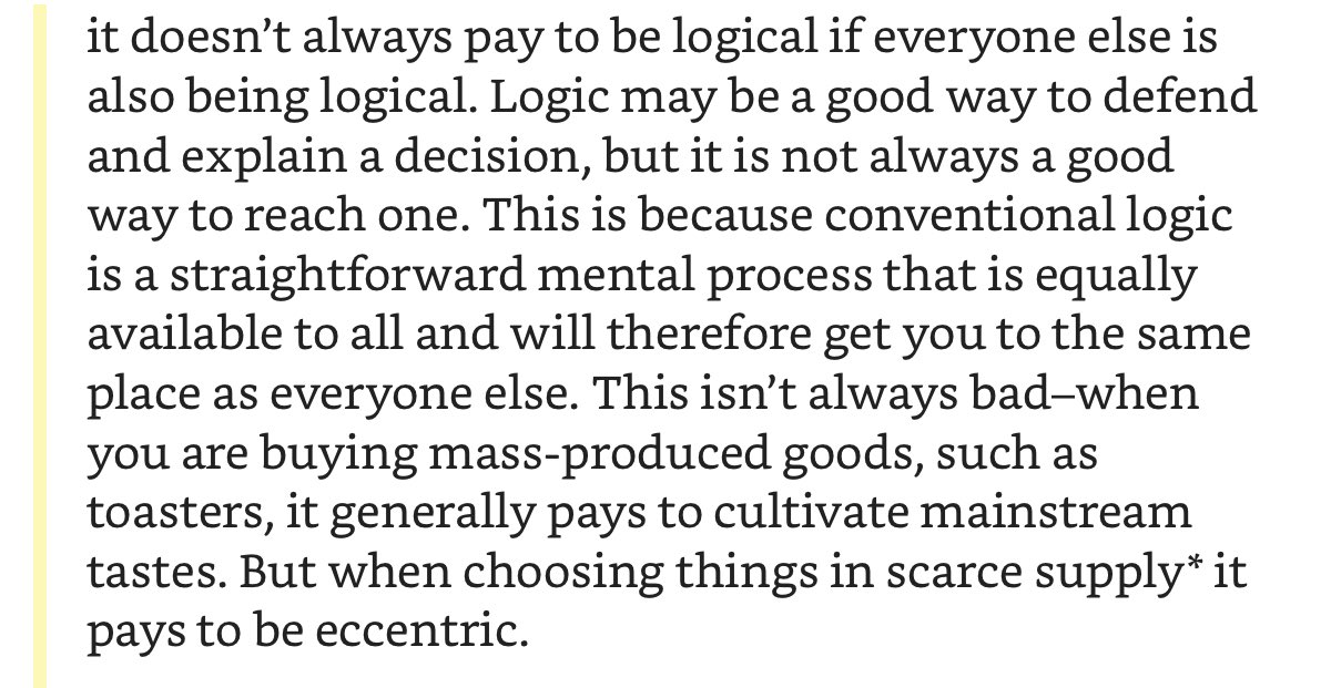 Still loving this book. Highly recommended. It doesn’t pay to be logical if everyone else is, too.